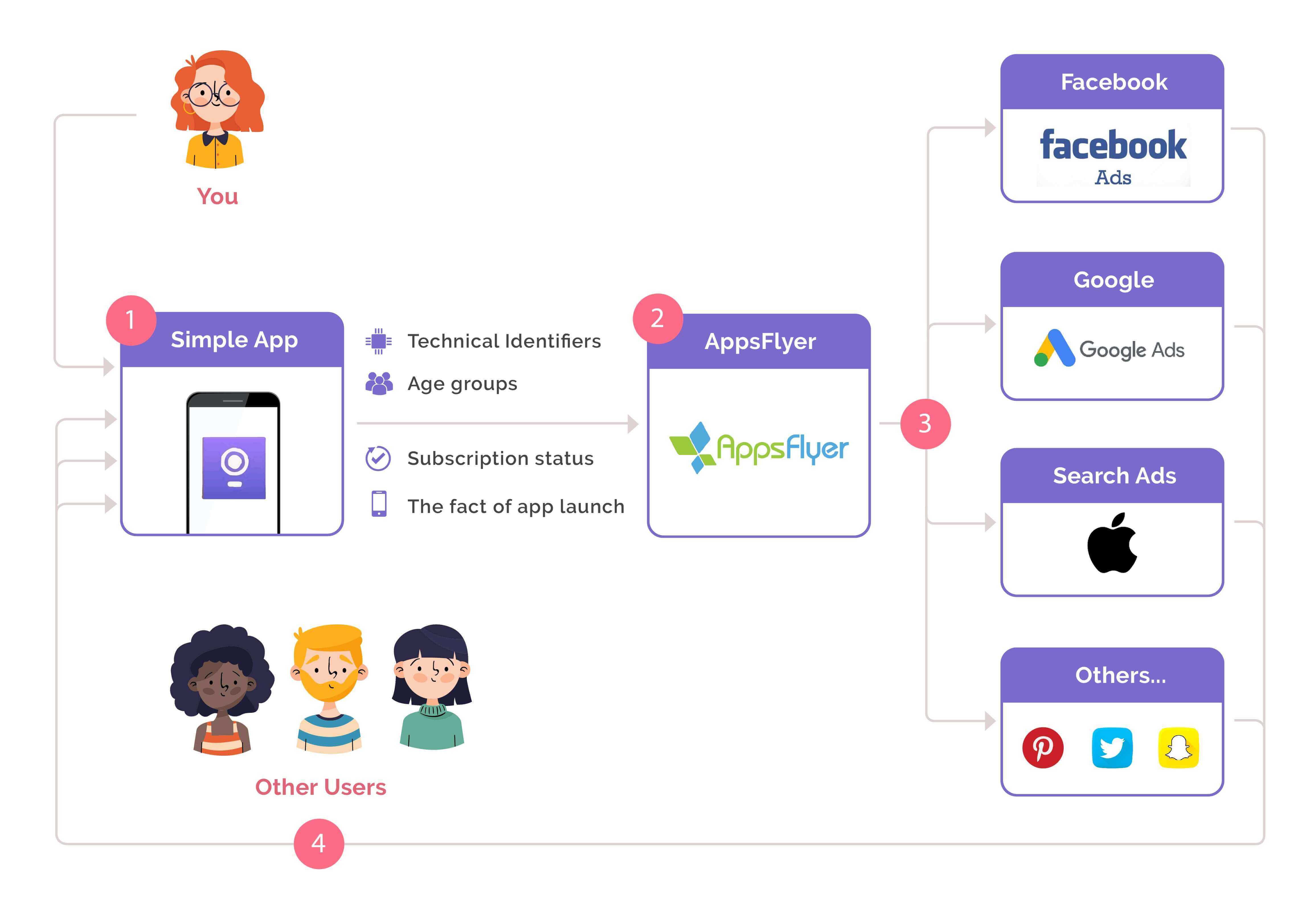 3. At the same time, AppsFlyer sends your data to some of its integrated partners (e.g. Pinterest, Google Ads, Apple Search Ads, Facebook marketing network, and a couple of others) to find people like you on different platforms, including social media websites. These integrated partners analyze your data (so-called “custom audience”) and show relevant information about the App to people who might be potentially interested in it (so-called “lookalike audience”).