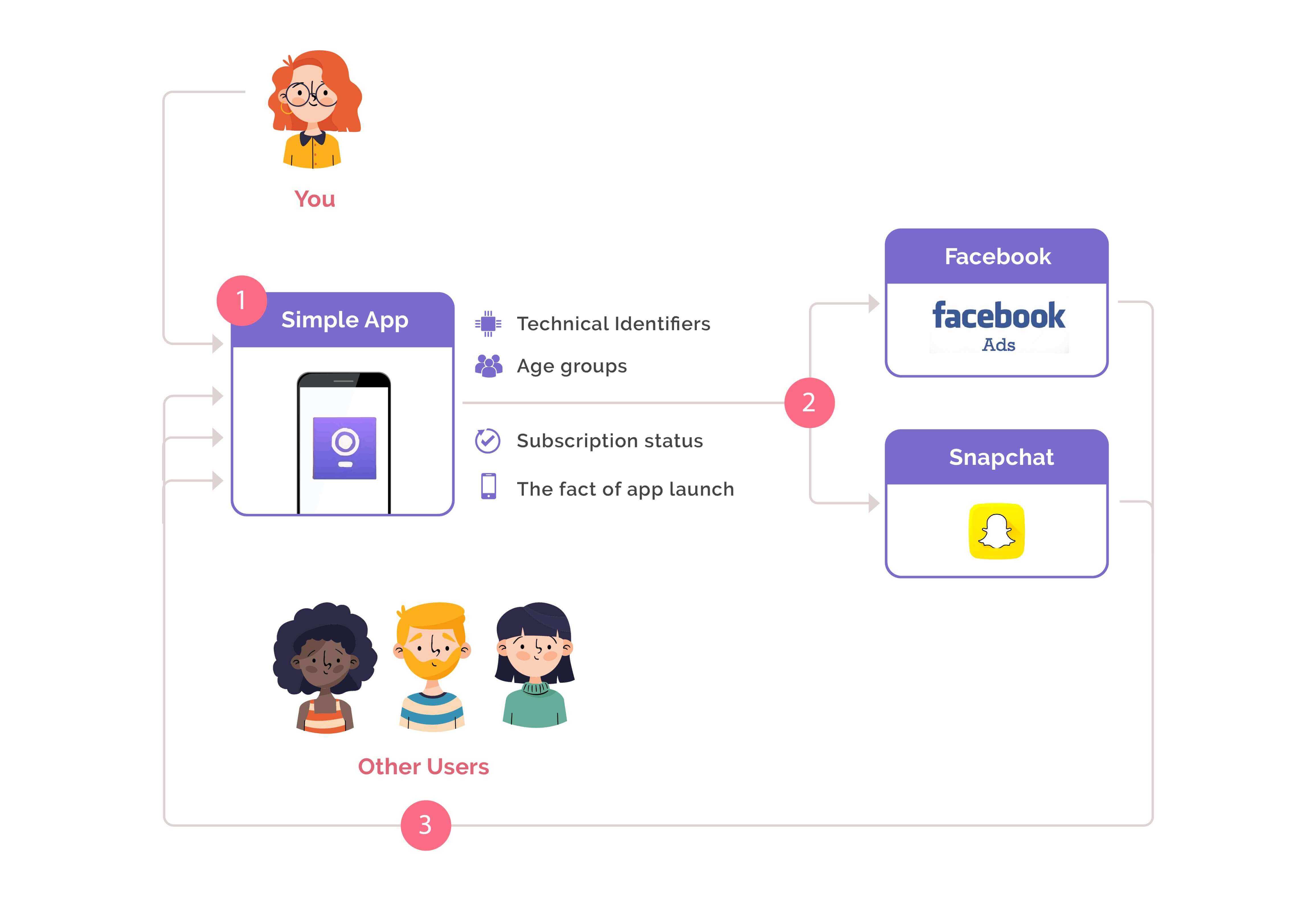 2. Simple App sends your data to Facebook Lookalike audience service and Snapchat to find people like you on these platforms. These third-party services analyze your data (so-called “custom audience”) and show relevant information about the App to people who might potentially be interested in it (so-called “lookalike audience”).